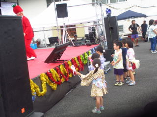 | 風もやみ雨も小雨になってくるとお大勢の客様がきてくれました。 | 主役の汽車ポッポの前ではいパチリ | テントの下でハワイアン音楽・ダンスのパフオ-マンス が行われています | |