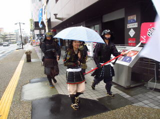 | 手裏剣道場ブ-スは良い雨宿り場です | お客さんも増えています | 乙女口広場に甲冑隊集合 | 移動開始 |