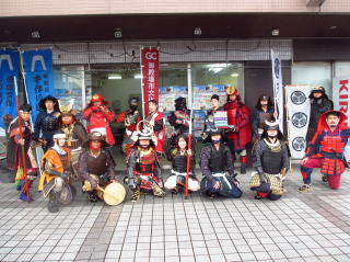 | 改札前でお客様のお出迎え | 富士山口に移動します、駅前広場で伝統文化もりあげ隊、てづくり甲冑隊のお披露目を行いました。 | ||