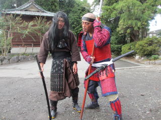 | 2023/08/05御殿場夏祭りが開催され、当日は御殿場市文化協会会長の米光氏を総大将に地元の小学生(保護者の方々)、高校生、武道団体、そしてコスプレイヤーさんのご協力を得て総勢60人余りの武者行列を実施することが出来ました。武者行列は初めての試みで心配でしたが子供神輿を先頭に行進を開始しました少年忍者隊、少年武者隊そして法螺貝吹鳴、太鼓の音が聞こえるや沿道の皆様の大きな声援を頂きました。行列の最中にも観客との写真撮影を頼まれ笑顔で肩を組んで写真撮影に応じていました、また、それって本物の甲冑ですか?などと質問が多く寄せられました